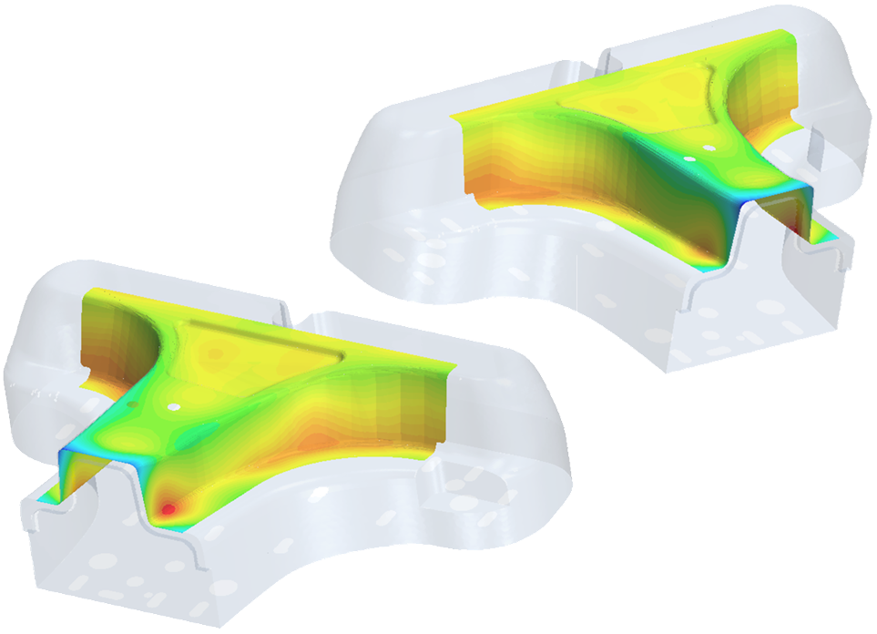 Das Umformwerkzeug wurde mit mehreren Heizelementen versehen. Die Anordnung der Heiz- elemente im Umformwerkzeug, deren Anzahl sowie deren erforderliche thermische Leistung wurde auf Basis von 3D-CFD-Modellen berechnet. Die Werkzeug- oberflächen wurden in der Simulation auf die geforderte Temperaturverteilung während des Pressvorgangs optimal ausgelegt.